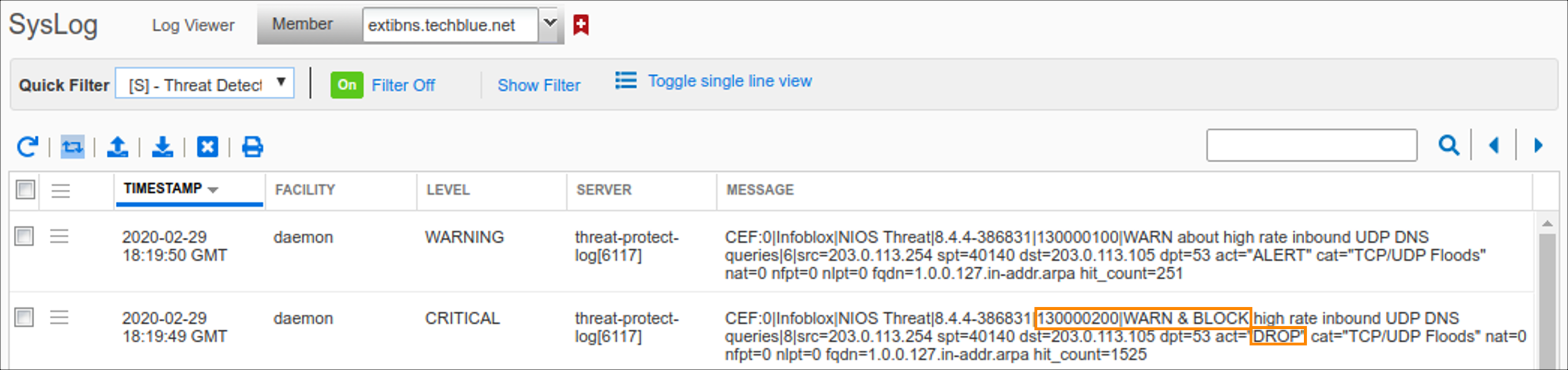 On the Infoblox NIOS UI, You should also be able to see syslog WARN alerts, indicating that 203.0.113.254 is sending too many UDP packets. It could be a volumetric attack. Rule 130000100 is triggered.