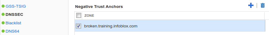 Click + to add a new entry for bogus.training.infoblox.com under the Negative Trust Anchor section, as shown below:
