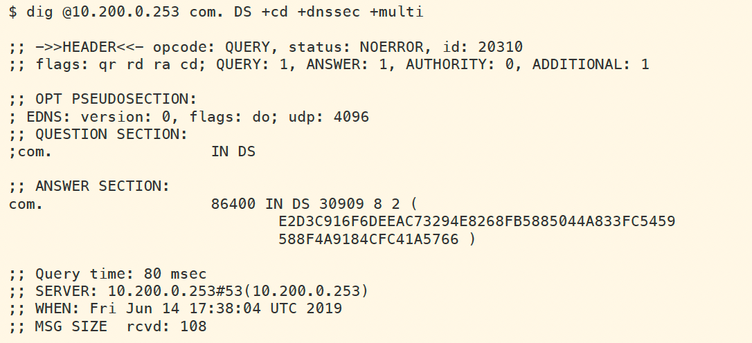 We can also perform dig directly against BOB (10.200.0.253) to see that it does not return any RRSIG when we query for DS of com, a domain we know is signed. This is an indication something is wrong on the recursive name server BOB. The figure below shows the query and result.