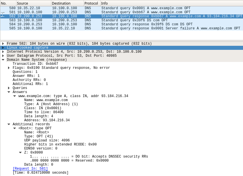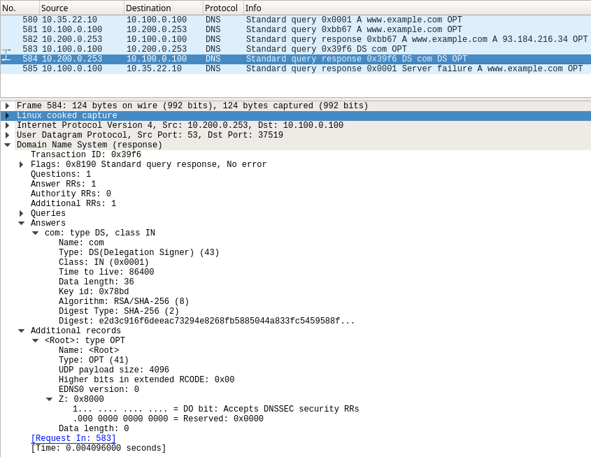 However, as seen below packet #584, there we receive just the DS records with no signatures. This causes the validating resolver ADA to return SERVFAIL to the client, and further research is required on theremote name server BOB (10.200.0.253), who accepts DO bit, but is has not returned the correct DNSSEC data.