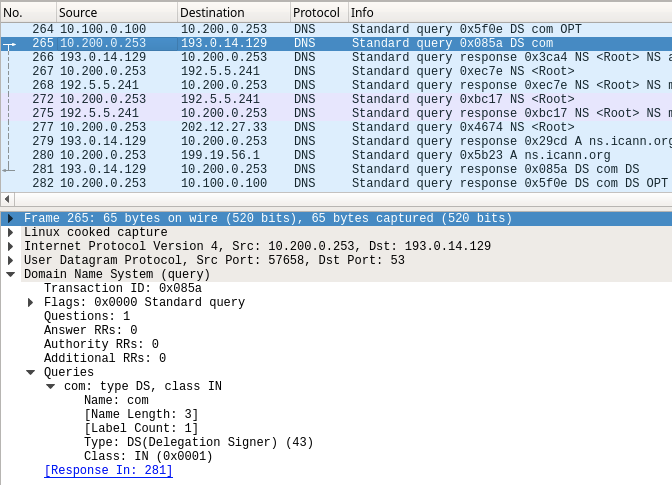 The packet capture (3612-task1-bob.pcap) was taken at the same time as the previous capture (3612-task1-ada.pcap) one on ADA (10.100.0.100), except this one was performed on BOB (10.200.0.253). Notice the packet #265 that is highlighted below. This packet is BOB reaching out to the Internet querying for the DS record, however, there was no additional options field in the packet. This indicates a misconfiguration on BOB (10.200.0.253), that EDNS0 is disabled.